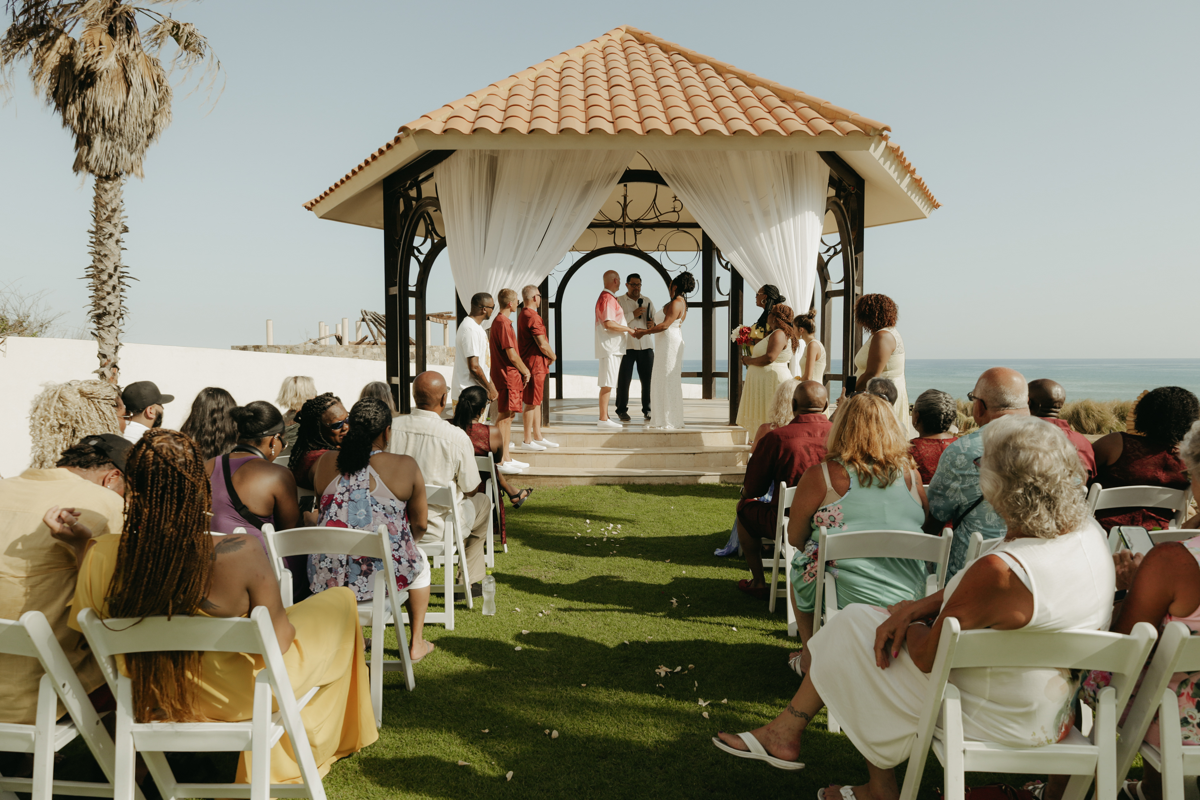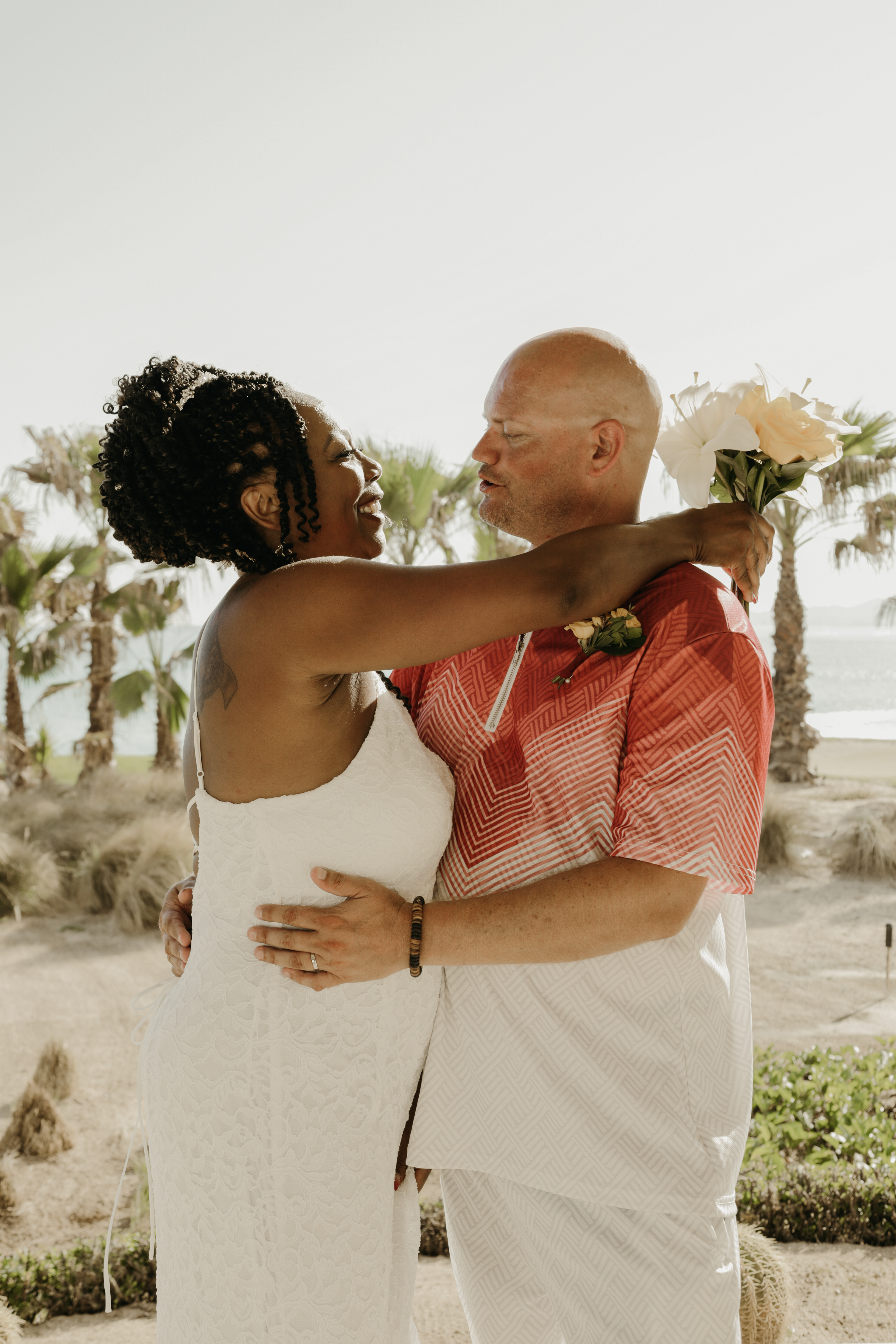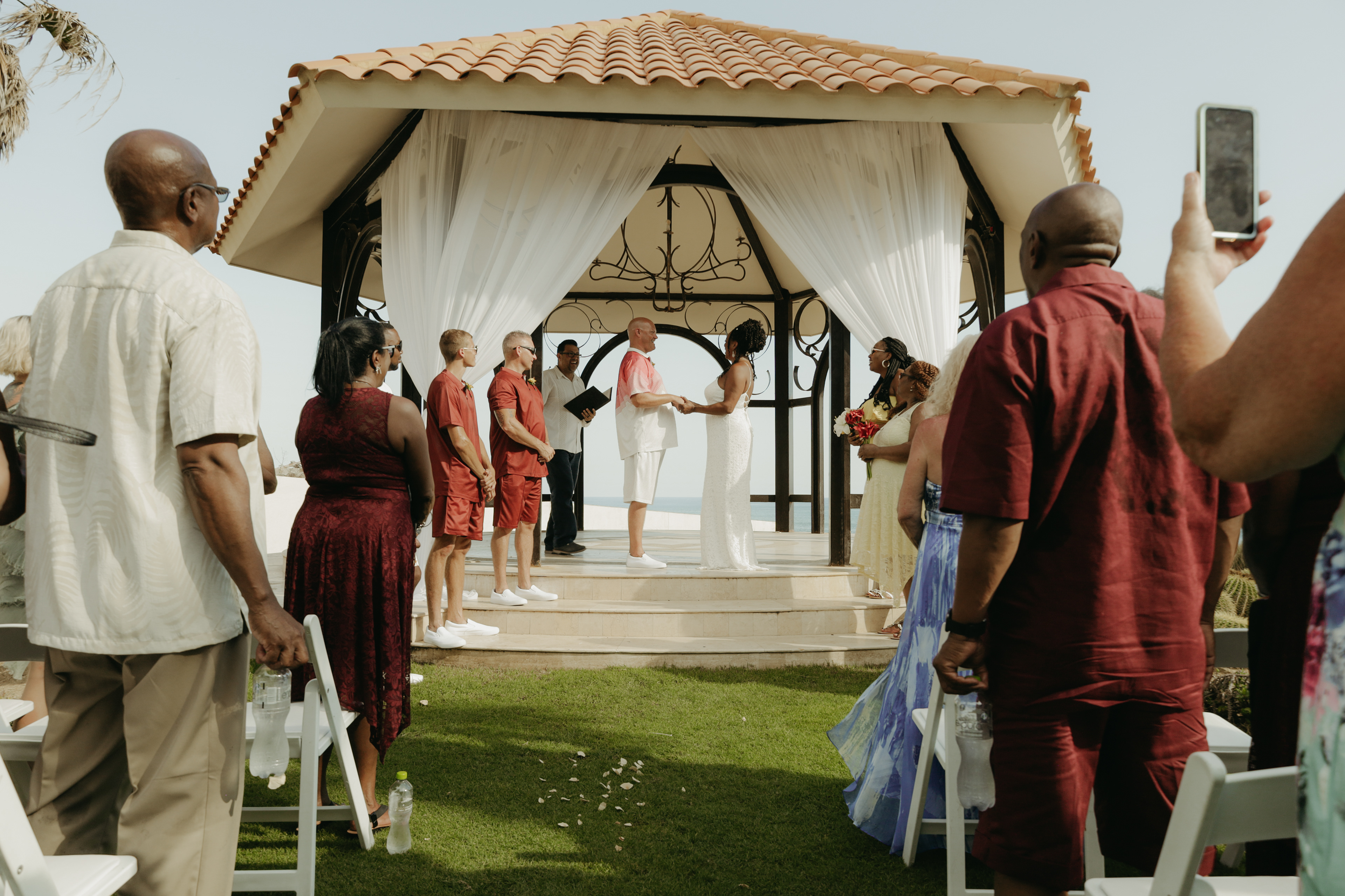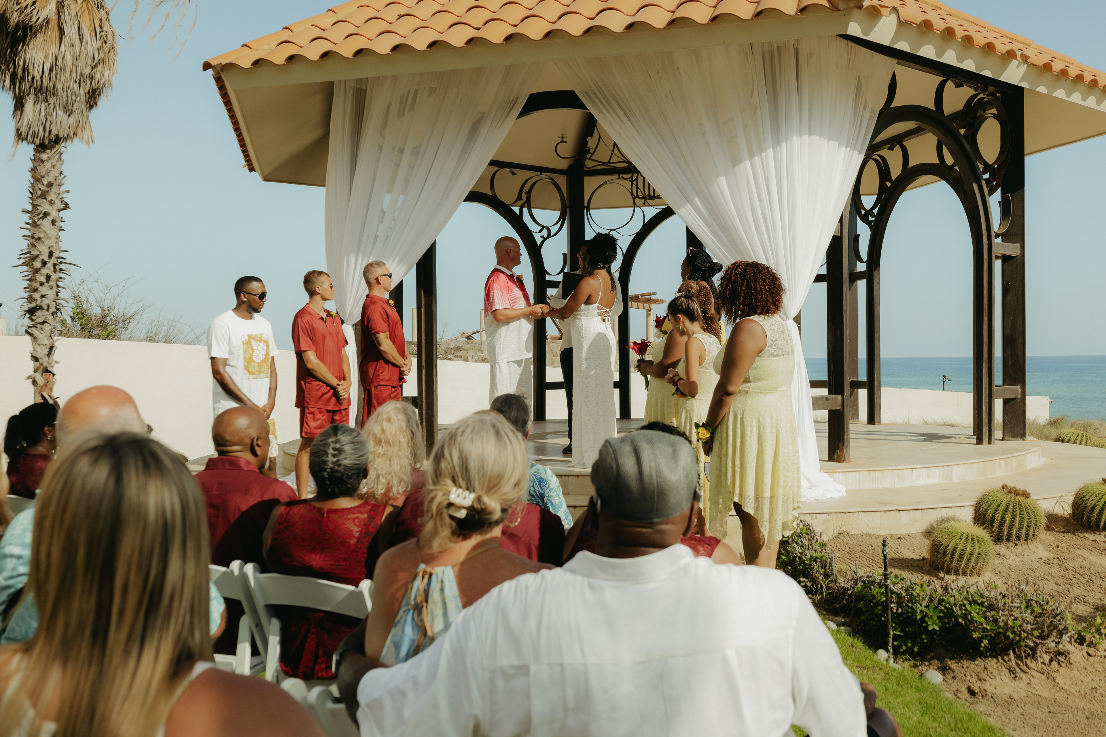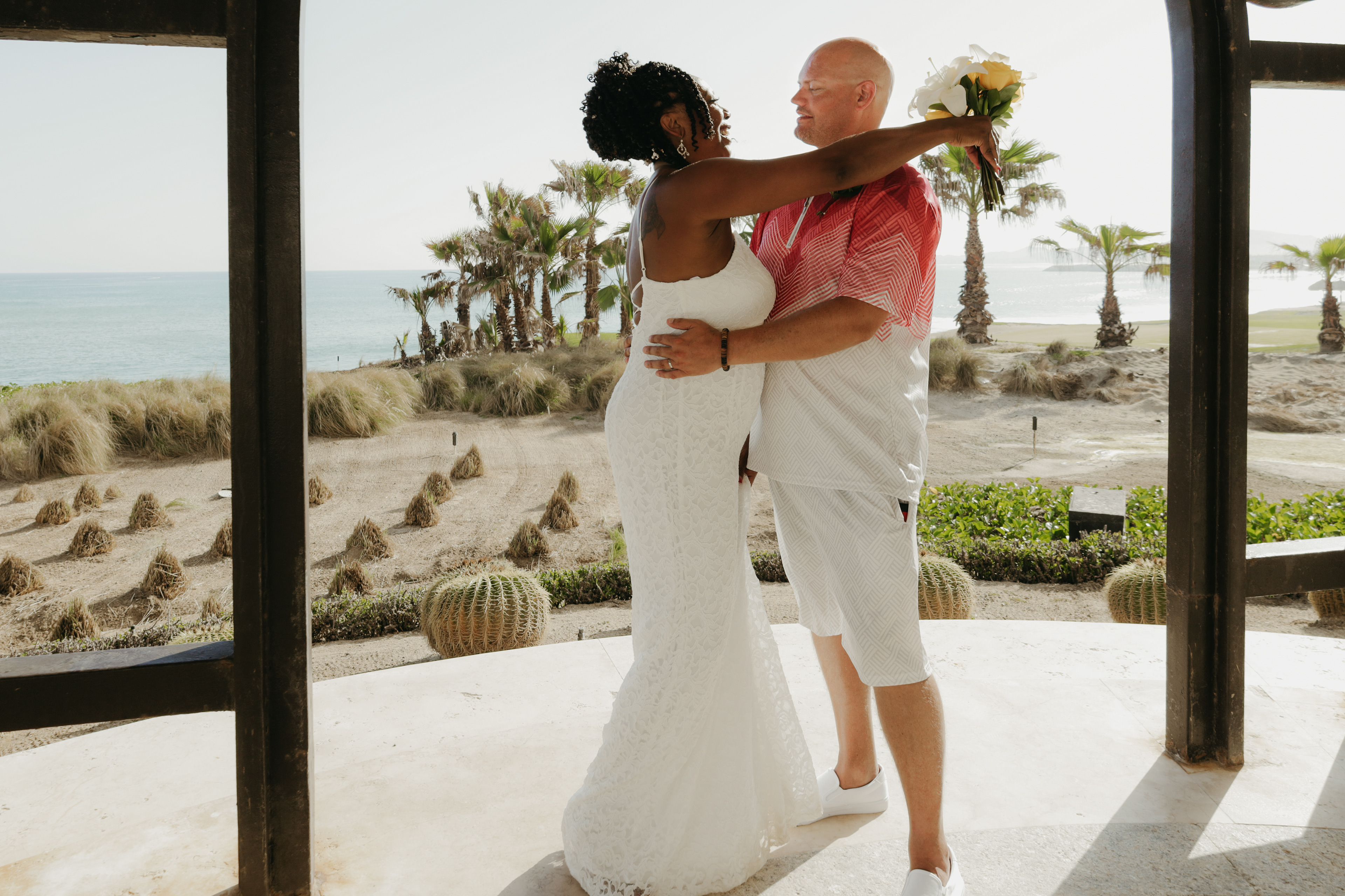 Loni and Jesse had their wedding on the east coast of Los Cabos. In a beautiful gazebo in front of the Sea of Cortez. Where their family and friends witnessed their engagement and love on a summer afternoon. Loni wore a beautiful dress with a nice back neckline, while Jesse was dressed in a fresh and very original suit. All the preparation took place at the Secrets Puerto Los Cabos resort.